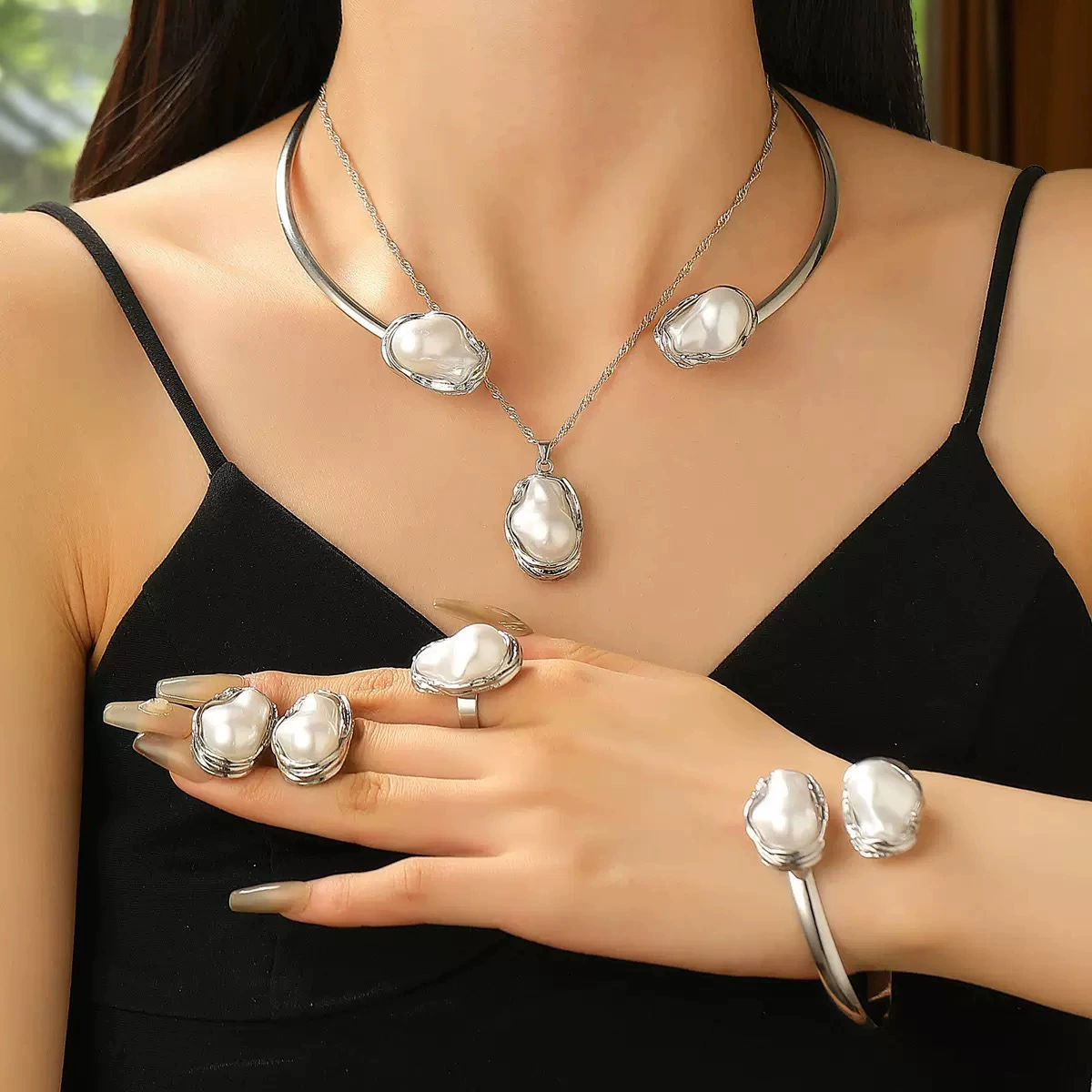 Five-piece set of gold necklace, collar, bracelet, ring, and earrings.